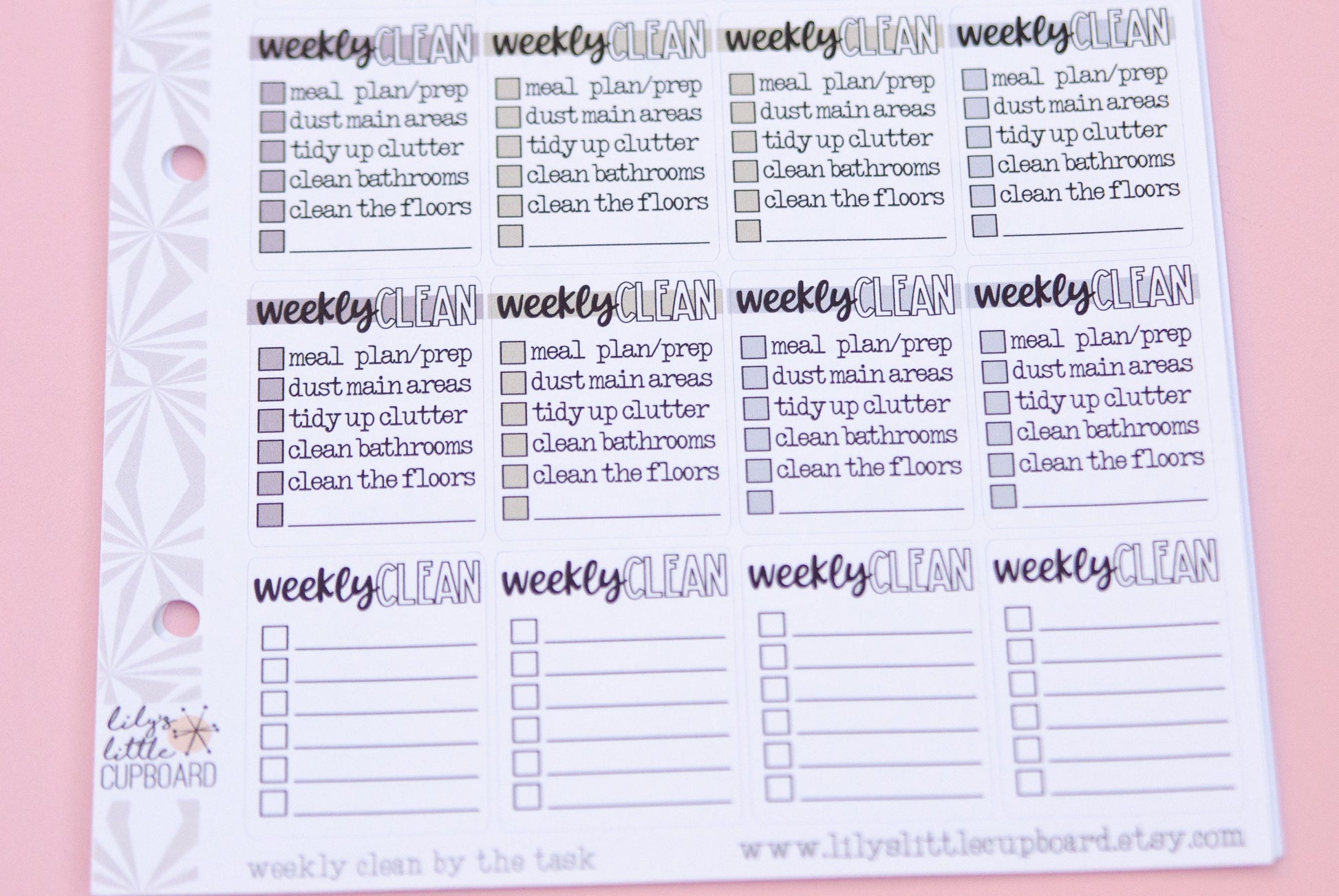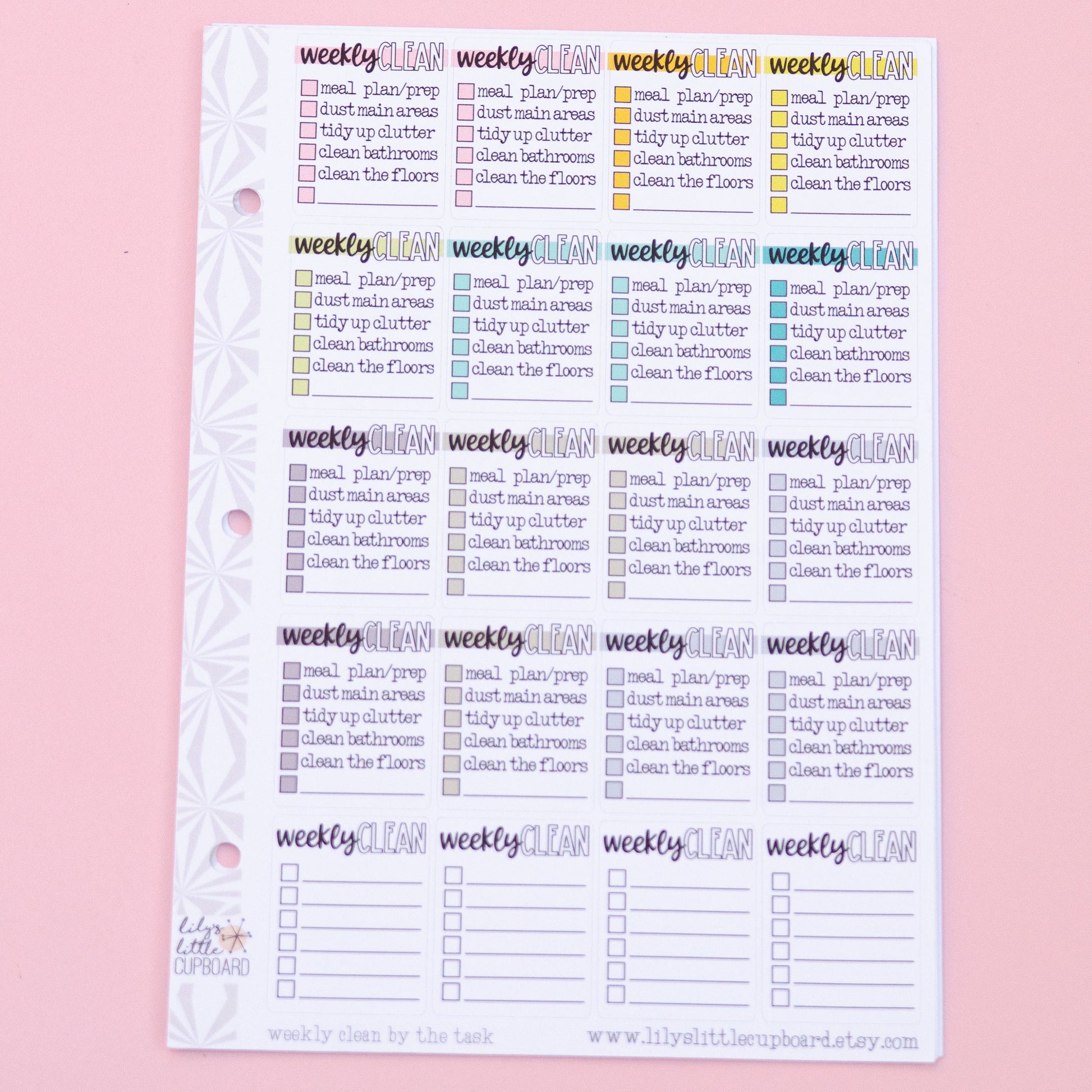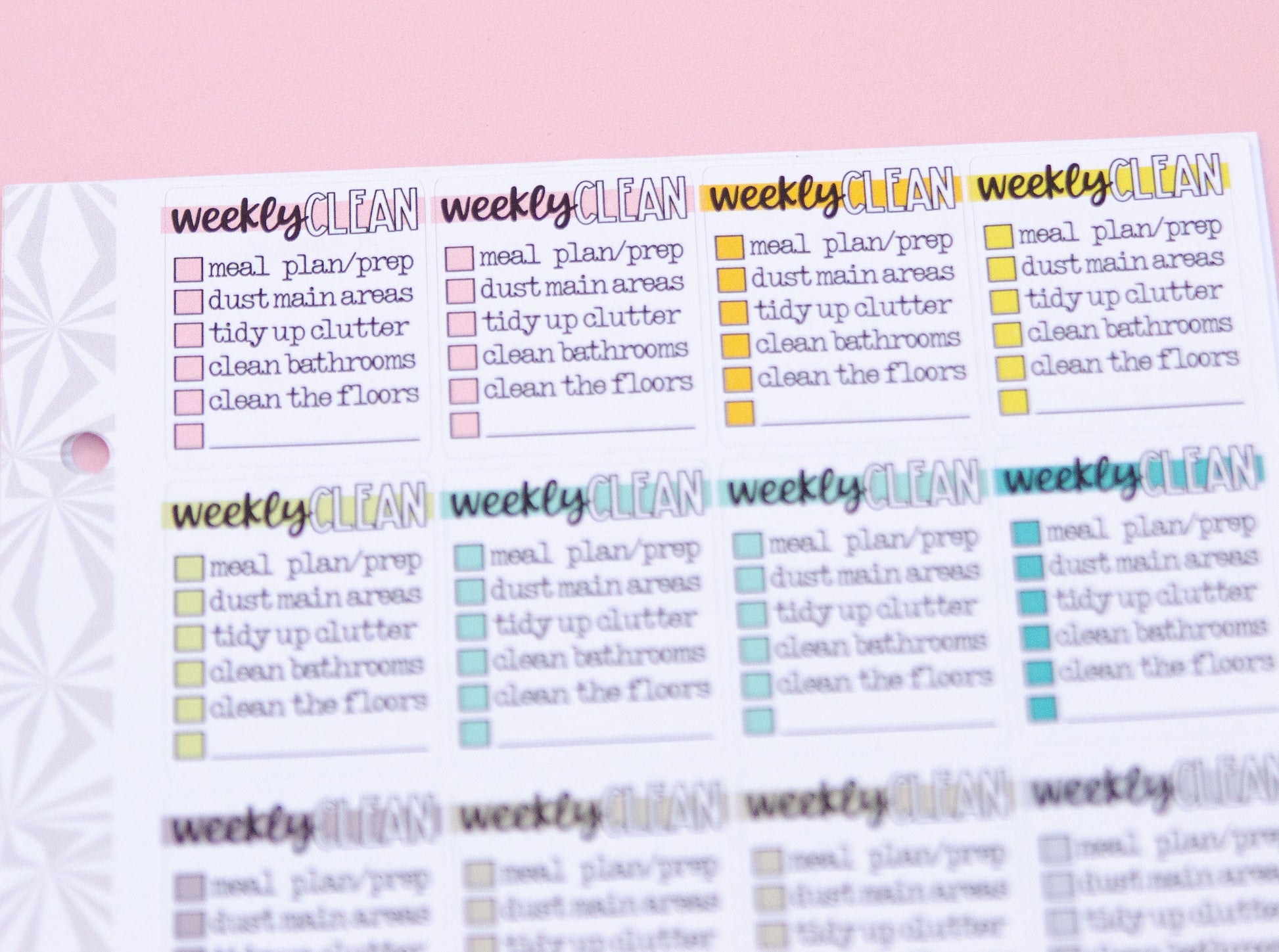 Cleaning by the task rather than room is the most efficient method for many people. Clean all the floors, dust all the shelves, one little task every day to keep you on track. Check it off for the win. This listing is for ONE sheet of 20 full box stickers as shown, in total. It includes 16 filled-in checklist stickers and also 4 blank checklists because reality is gonna reality, and some weeks will be different. Capture those differences that aren't your regular routine!