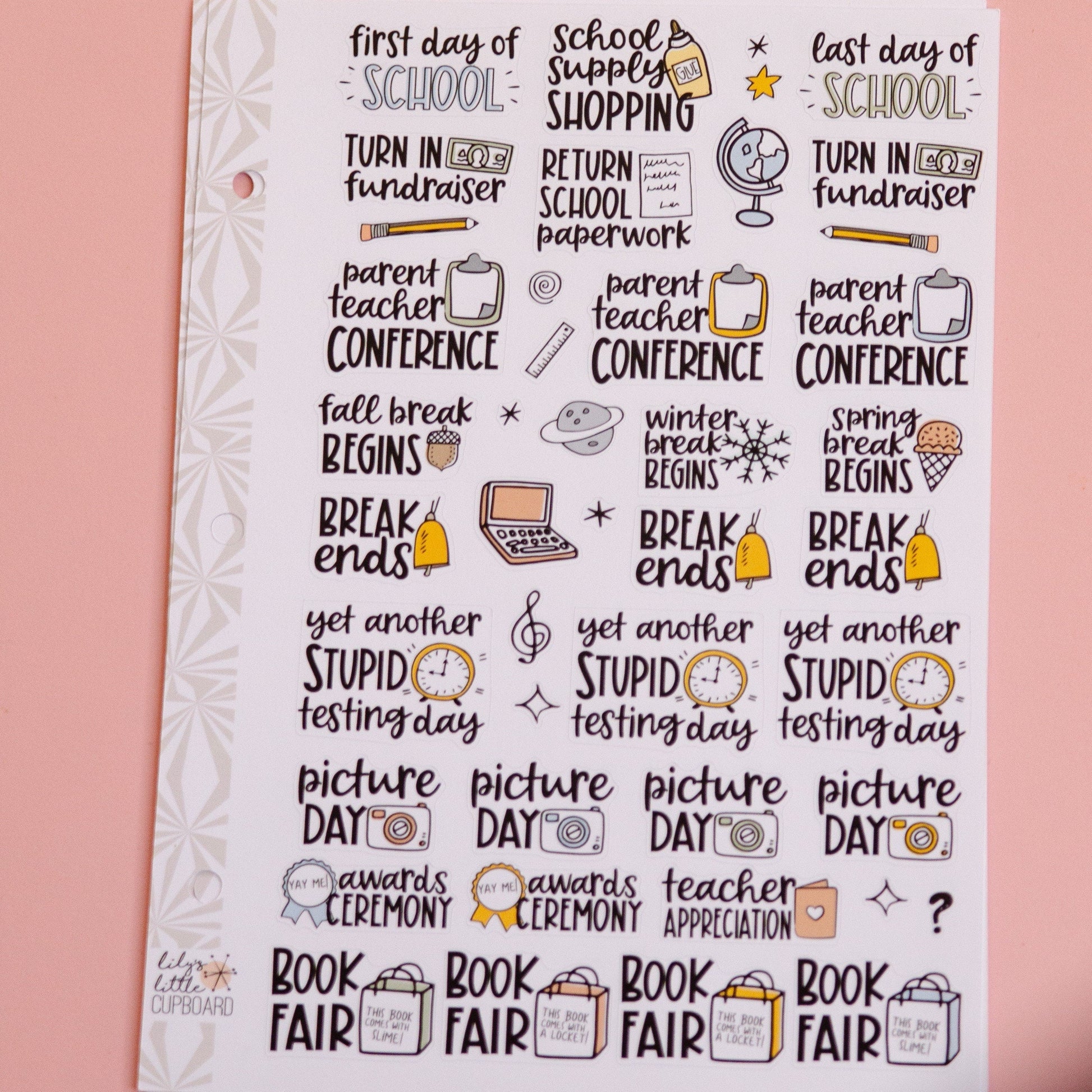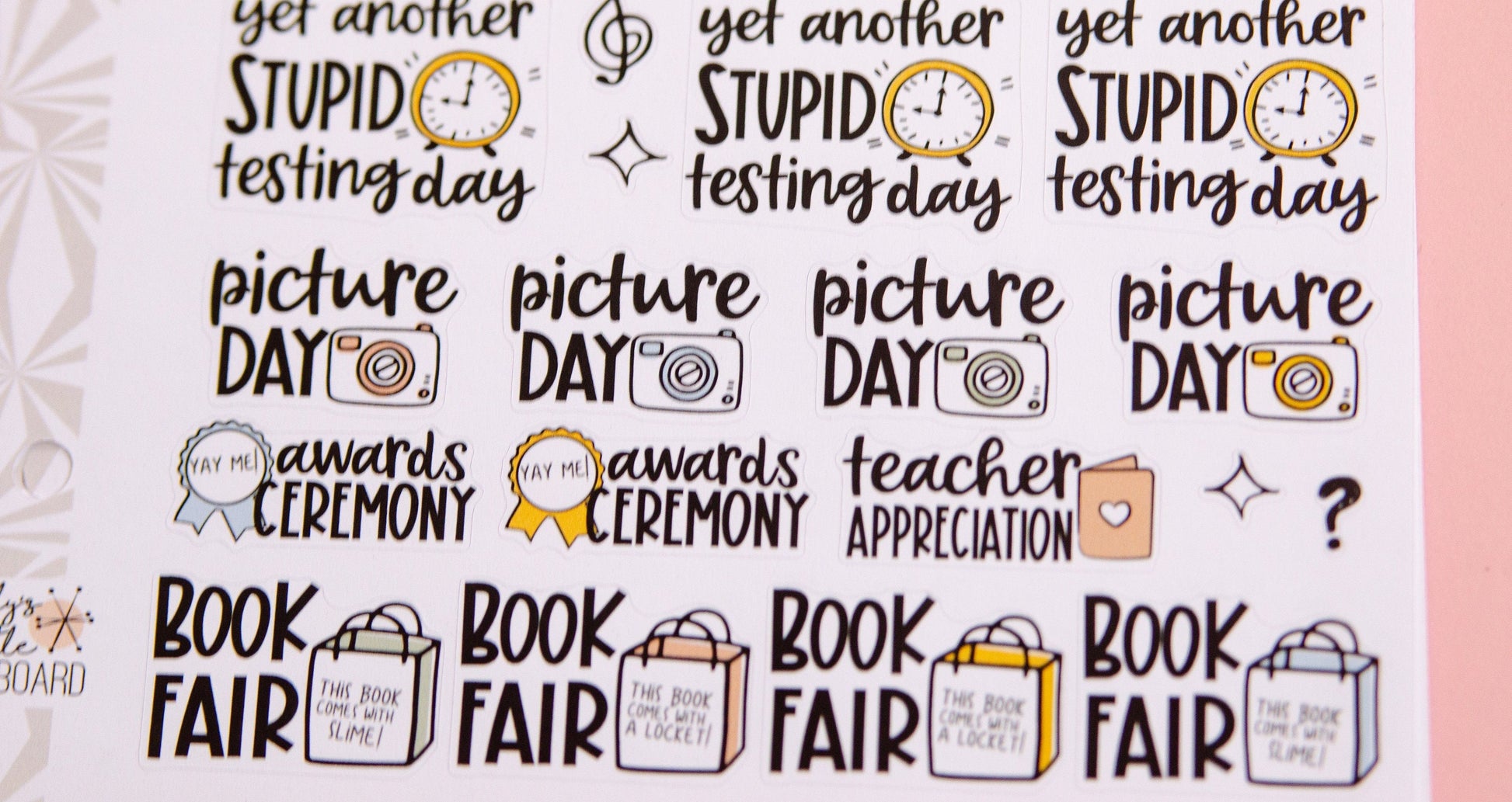 School stickers! This sheet includes a variety of mixed script stickers and deco as shown. Sticker size varies, but all stickers are less than 1.5" wide and will fit into most planners.