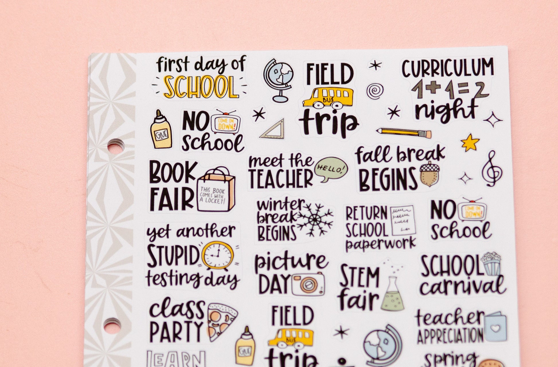 School stickers! This sheet includes a variety of mixed script stickers and deco as shown. Sticker size varies, but all stickers are less than 1.5" wide and will fit into most planners.
