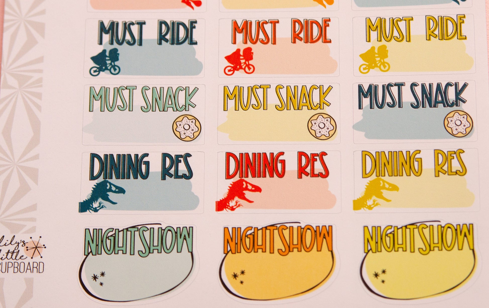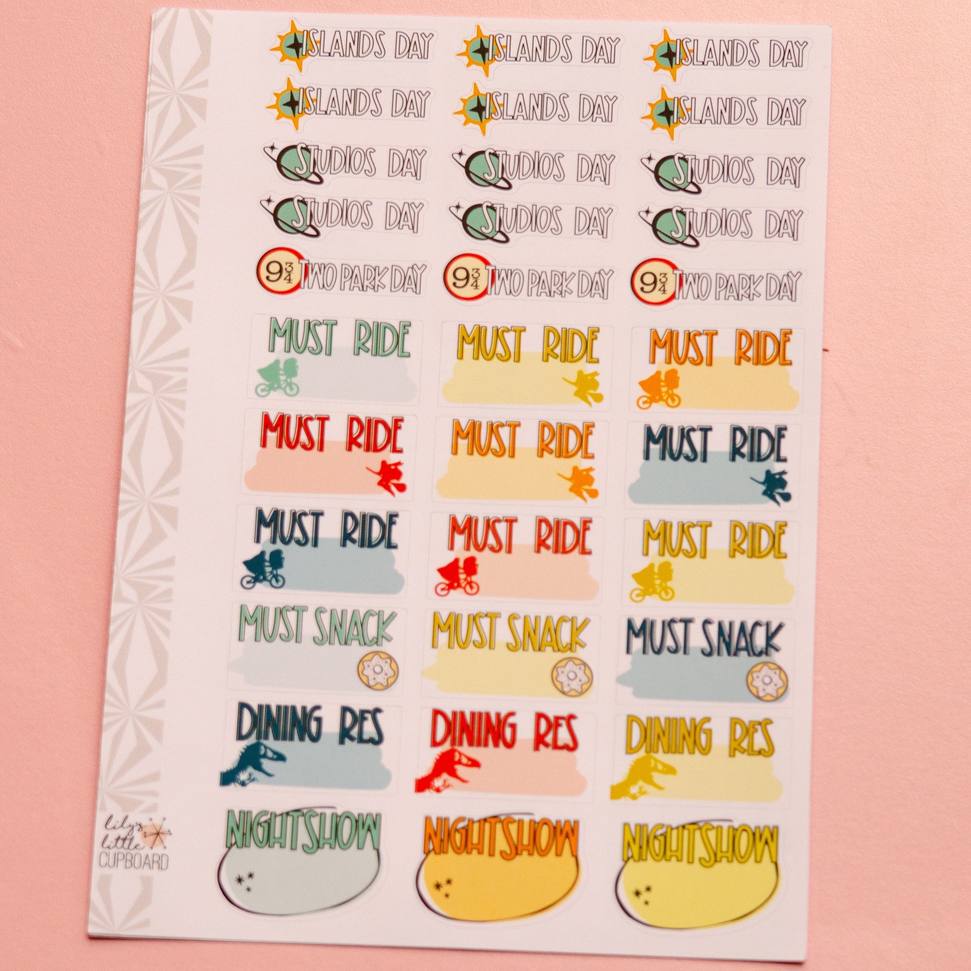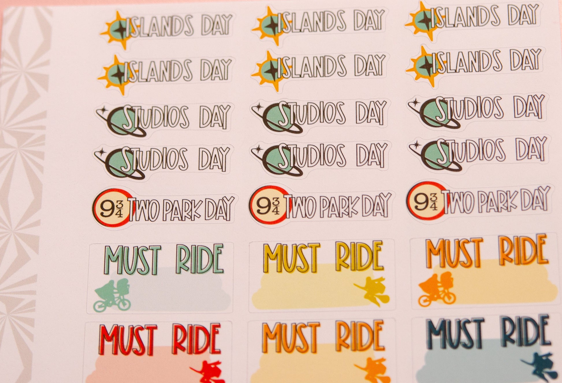 Theme park enthusiast? Or just a theme park vacation, these stickers are here to help you map out your days. Which parks you'll visit on which days, which rides you can't miss, and of course, your favorite snacks. Yes, the snacks are tragically overpriced, but so worth it. This sheet includes: