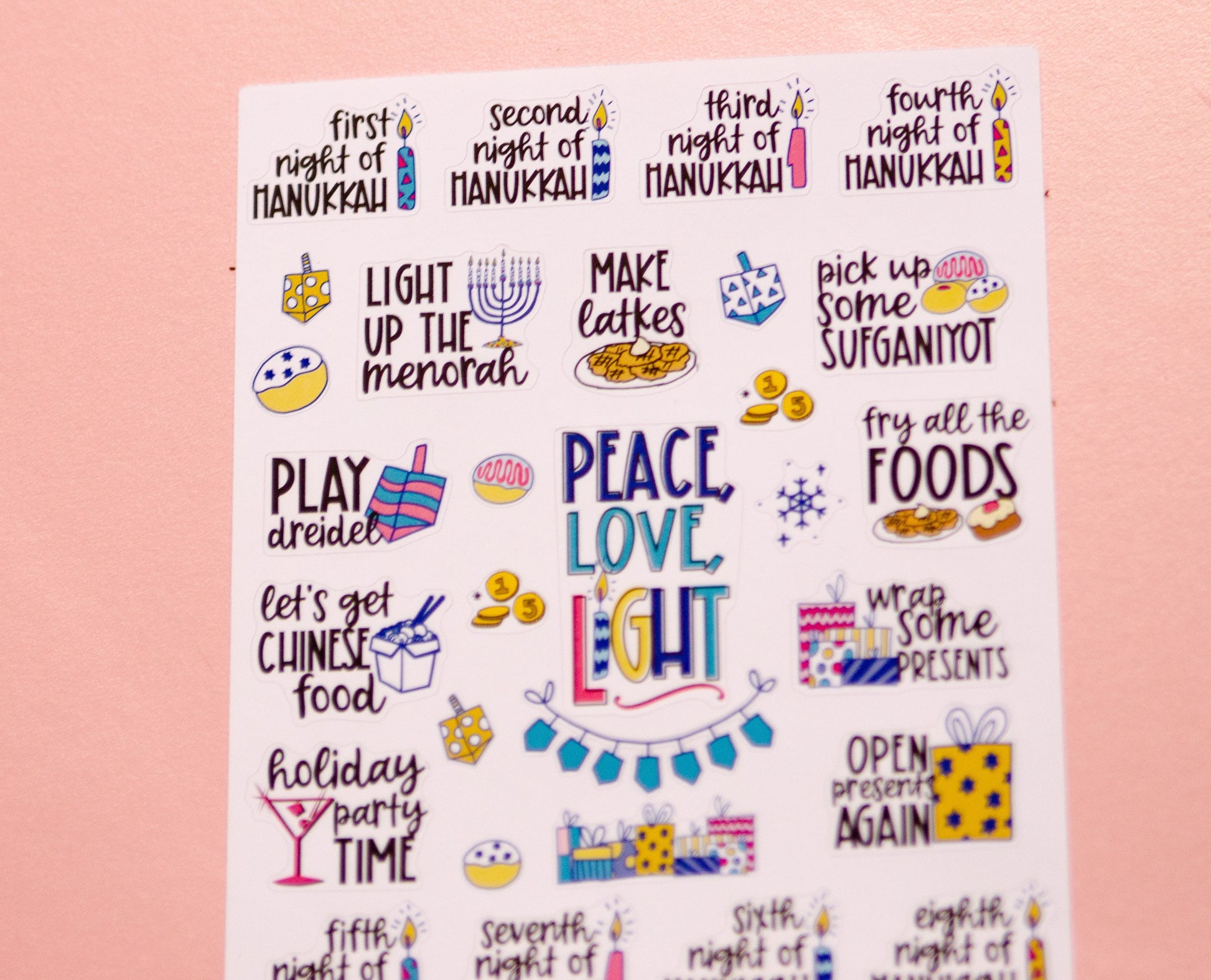 A sheet full of Hanukkah to dos and activities, plus a smattering of deco just for fun. All stickers are die cut to the shape of the typography and the artwork. Special thanks to Elana Coan for helping me create this sheet.