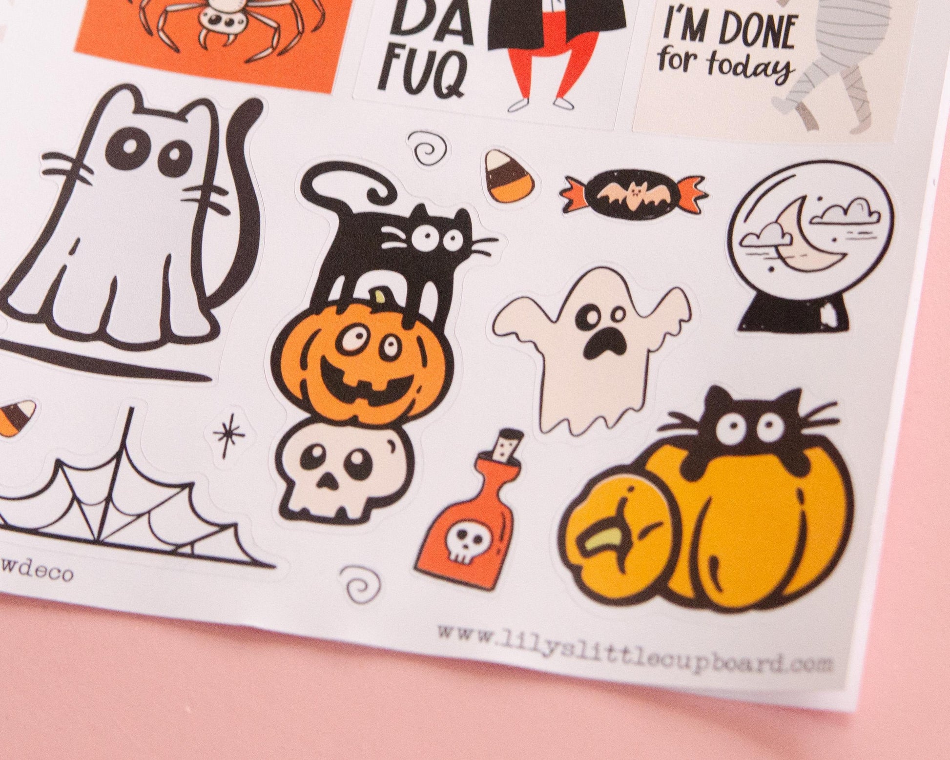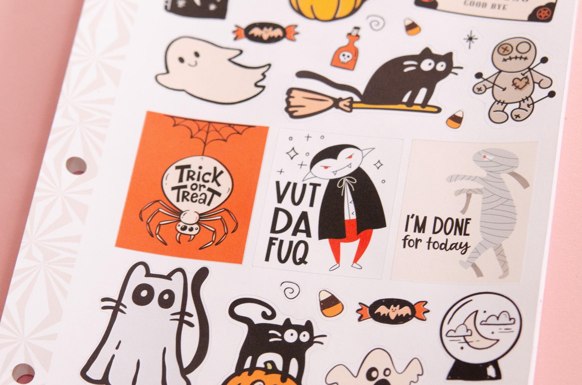 This listing is for one set of Halloween themed stickers for your planner, paper crafting, bullet journaling, junk journaling, whatever! This sheet includes 3 "full box" stickers and a variety of spooky jumbo deco stickers.