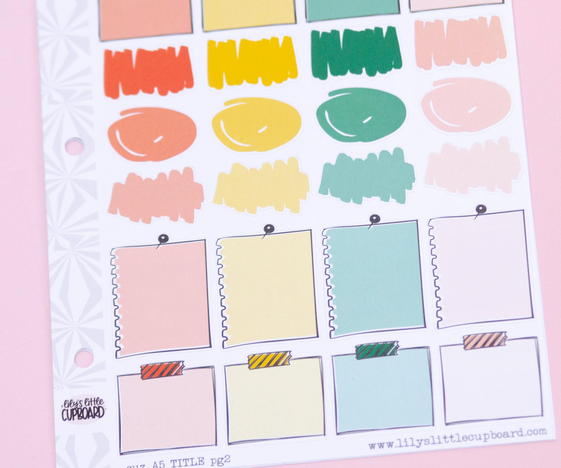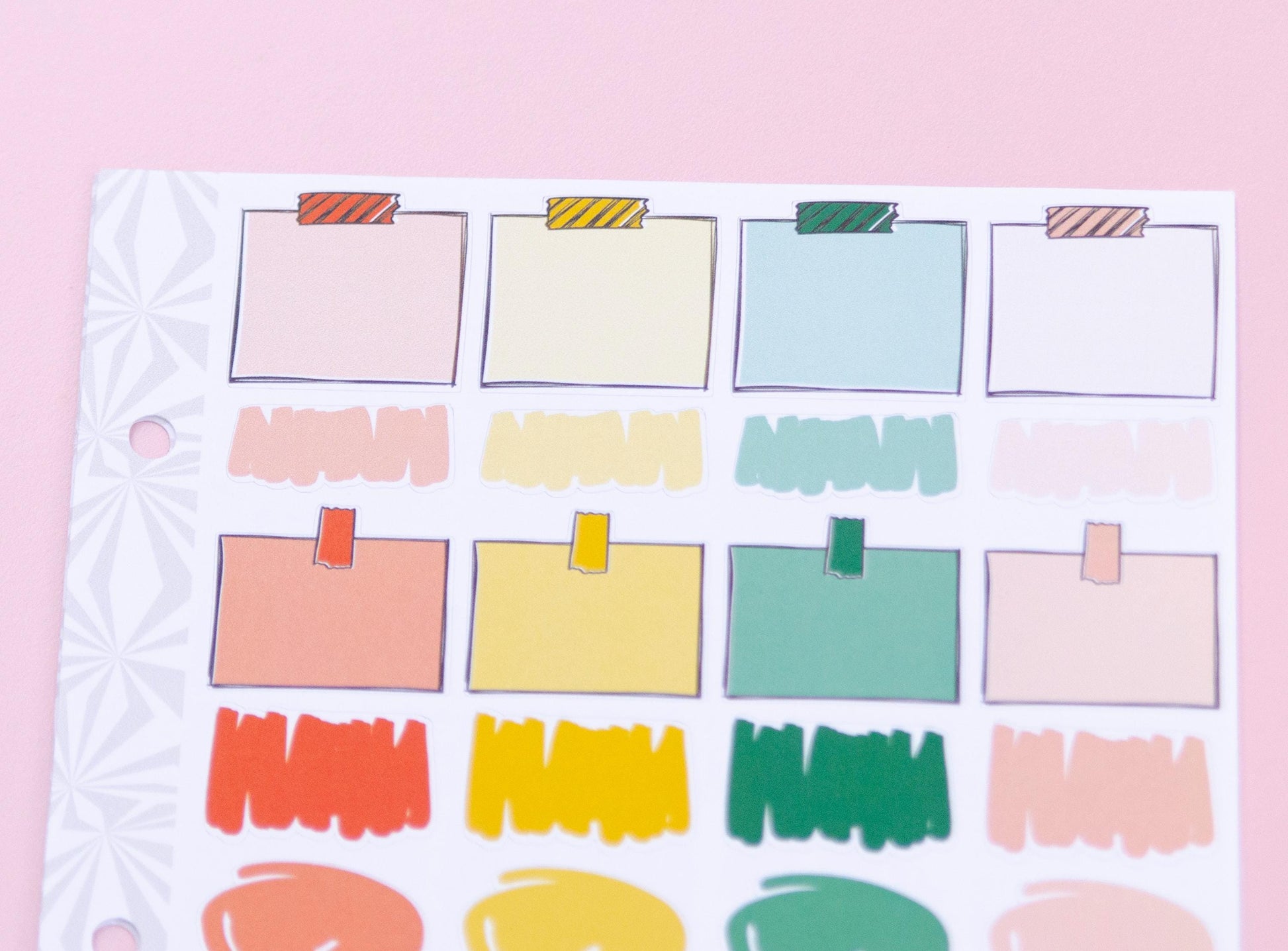 A5, Hobonichi Cousin, and other planners who have those 1.25" width columns, this sticker kit is for you. All box stickers in this kit are 1.25" wide with varying heights. The script stickers vary, but are designed to fit within a 1.25" column. the washi strips are 5.25 inches long by .5 inch high. This is a two-page kit but it's also available a la carte