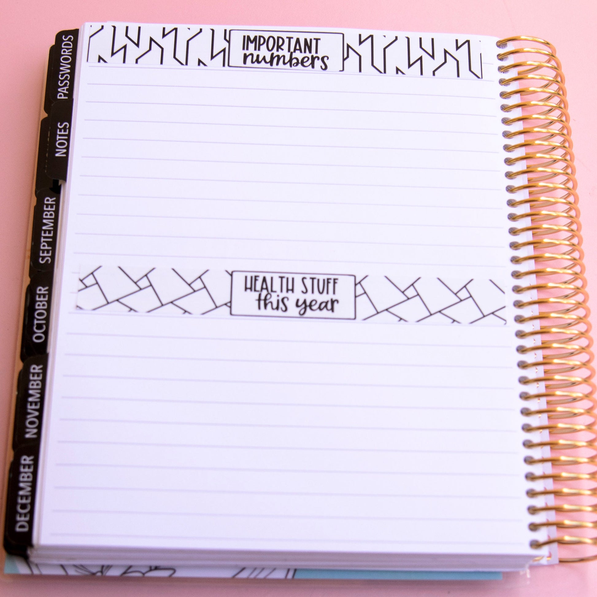 Are you a notes-pages-user? Use it for all those life-organizing lists and turn it into your own little reference section. (Honestly, I refer back to this section more than any part of my planner.) This version of notes pages headers is the most versatile version EVER! This kit is available as a 2-page set, or either page on its own, depending on your planner and your needs.