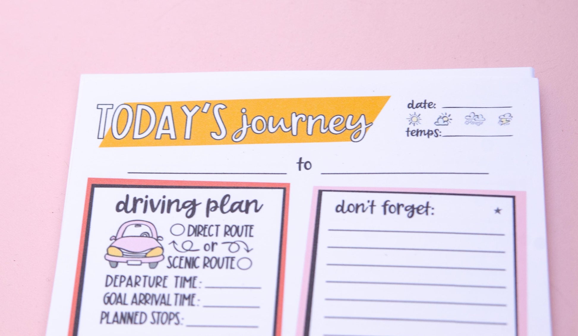 Notepads for people who really love t-h-i-c-k paper! This notepad is designed for planning your road trips both near and far. Whether it's a multistop road trip or you're just driving from one city to the next and back again, this planner helps you plan out that travel day. It's not gonna help with the traffic, the closures, and whatever other obstacles the universe will throw at you, but it's easier to reroute when you've got a starting point.