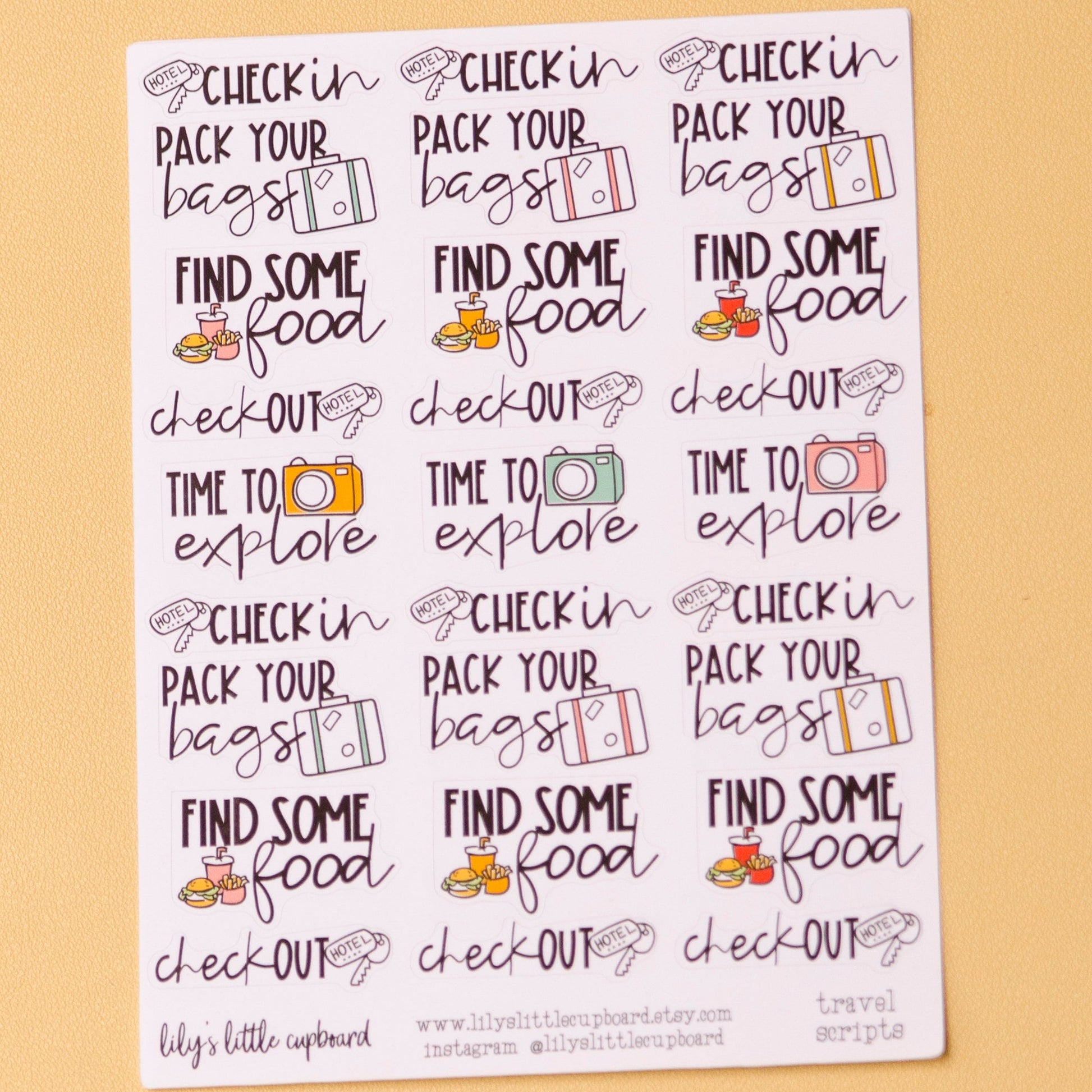 Script stickers with icons for some travel needs. This sheet includes: